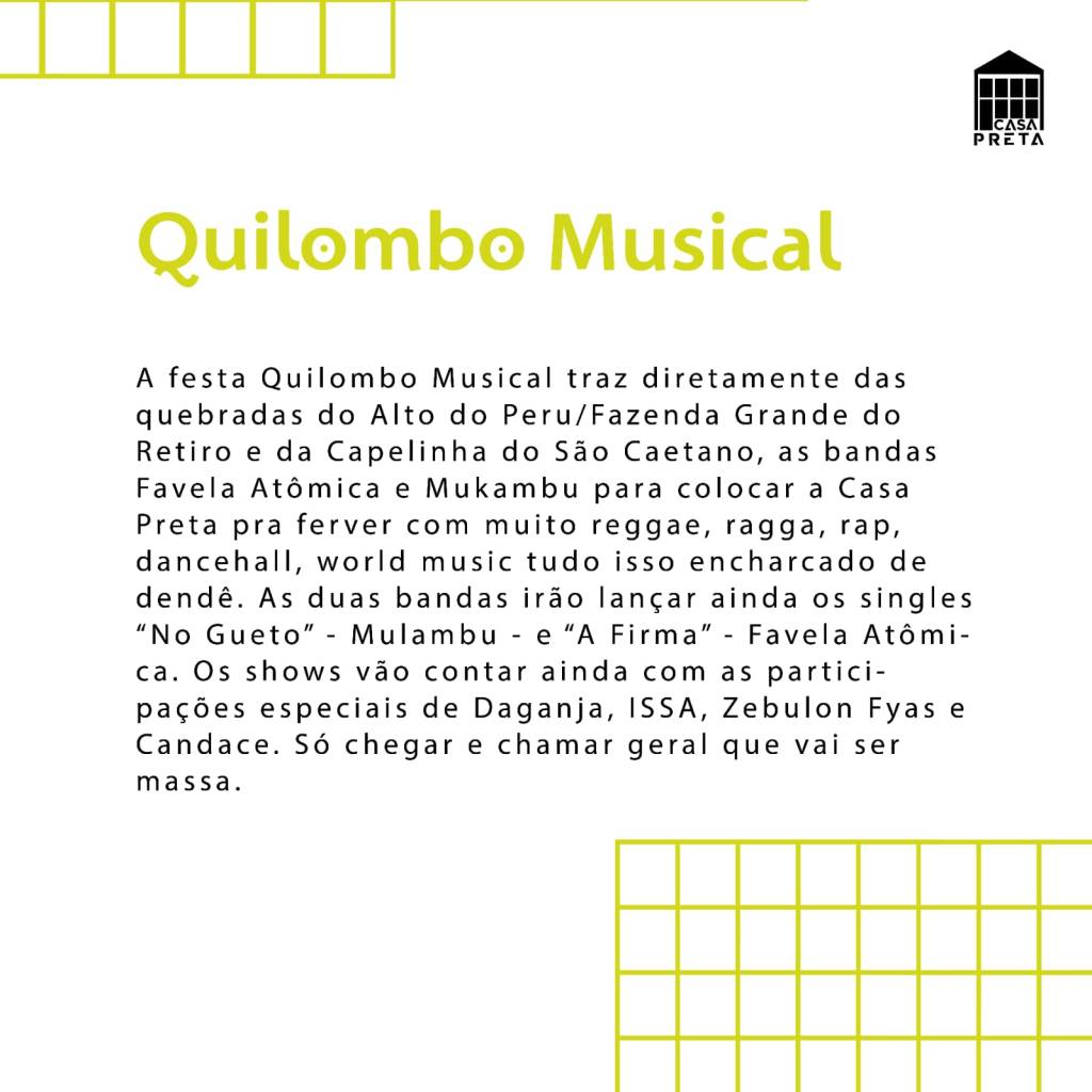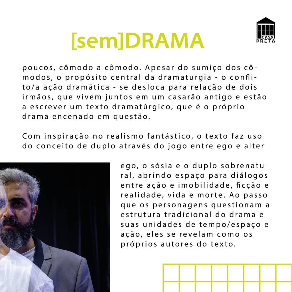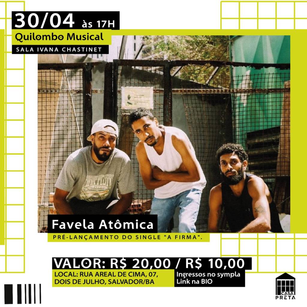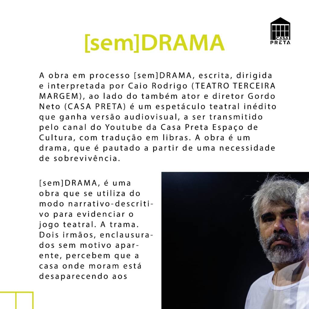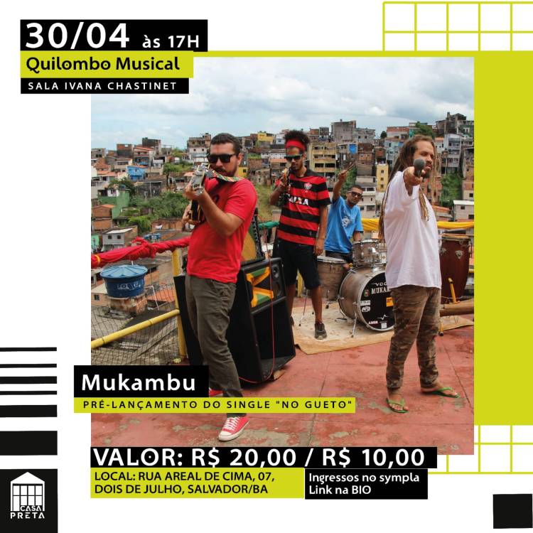 Sem drama. Em abril, a Casa Preta Espaço de Cultura será desmontada para transformar-se em quilombo musical. Um trocadilho para as duas atrações artísticas presenciais deste mês, o solo experimental “Desmontando a Casa”, da atriz Mariana Freire, numa curta temporada de 21 a 24 de abril, na Sala Ivana Chastinet, e no último dia do mês, 30 de abril, o espaço é remontado para os shows do evento Quilombo Musical, das bandas Mukambu e Favela Atômica, que trarão participações especiais para suas apresentações. Entre respiros e para assistir do sofá de casa e em família, no canal do Youtube da Casa Preta, de 28 a 30 de abril, a obra digital em processo [sem]DRAMA.