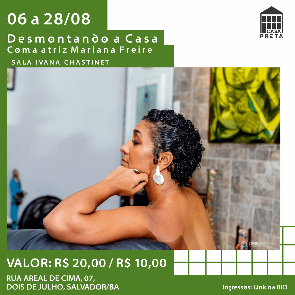 A desmontagem de uma montagem de 18 anos de trajetória. É o que propõe o solo experimental “Desmontando a Casa”, da atriz Mariana Freire, com apresentações de 06 a 28 de agosto, sábado (19h) e domingo (17h), e ingressos a valores acessíveis R$ 20 (inteira) e R$ 10 (meia), com compra através do whatsapp (link na BIO da Casa Preta).