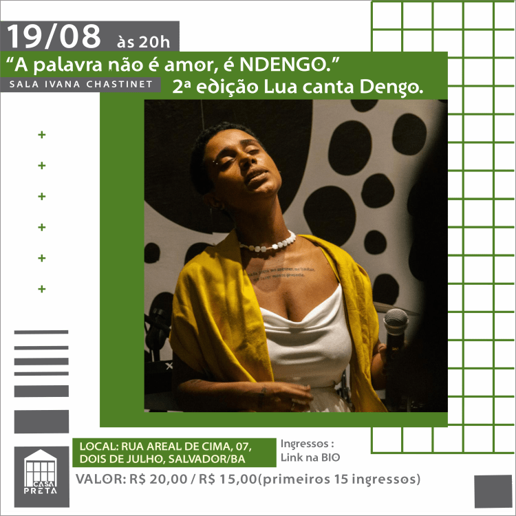 Projeto em que Lua faz da sua voz ato, reforçando segundo a escritora Bell Hooks que “o amor é uma ação”, cantando o dengo em tempos de brutalidade. Abarca a perspectiva da nossa #afetividade no seu sentido ancestral, por isso, “dengo” – palavra de origem bantu da língua Quicongo, um amor que se canta/vive genuíno, liberto e em constante movimento e ação.