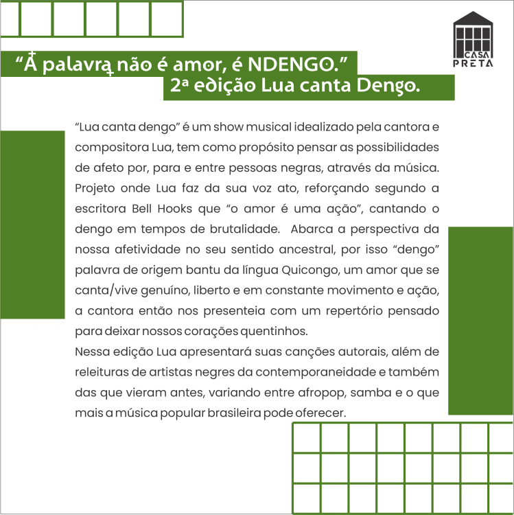 “Lua canta #dengo” é um show musical idealizado pela cantora e compositora Lua, tem como propósito pensar as possibilidades de afeto por, para e entre #pessoasnegras, através da música.