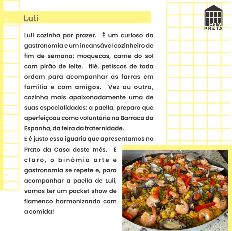 Nesta edição, Luli prepara sua #Paella e nos aproxima dos encantos gastronômicos da #espanha. E claro, o binômio arte e gastronomia se repete e, para acompanhar a paella de Luli, vamos ter um pocket show harmonizando com a comida: Cuadro Flamenco, formado pela bailaora, professora e coreógrafa Flora Bacelar (@florasouzabacelar) e pelo cantor, compositor e guitarrista flamenco Lucas Dourado (@luquenis), ambos com mais de 20 anos de dedicação a essa Arte.