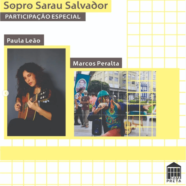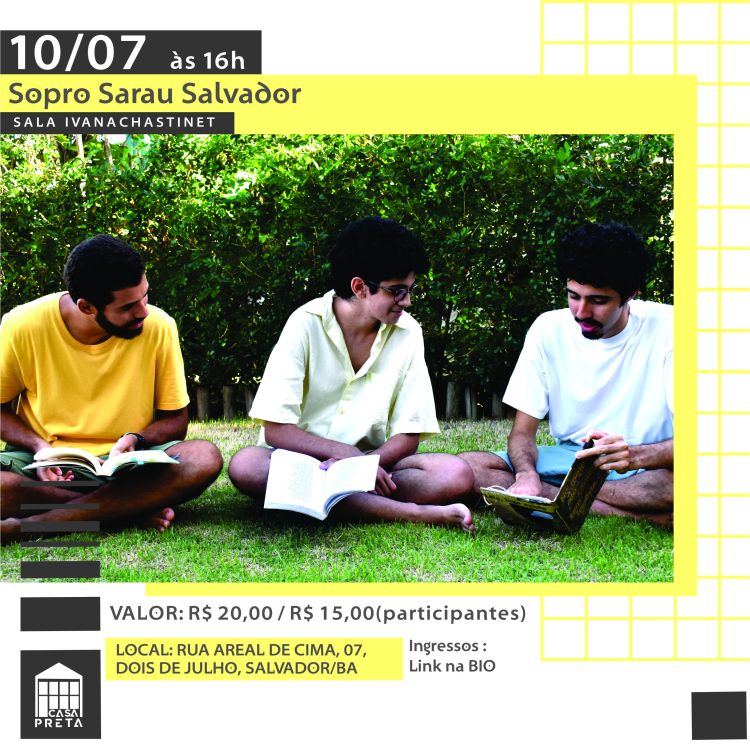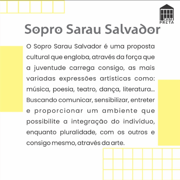 A Casa Preta desde o retorno às atividades presenciais pós-pandemia tem sido espaço para encontros artísticos de todos os tipos, inclusive daqueles em que a #palavra é declamada. Em julho, no dia 17 de julho, a Sala Ivana Chastinet será palco do Sopro Sarau Salvador, uma proposta cultural que engloba, através da força que a #juventude carrega consigo, as mais variadas expressões artísticas como: #música, #poesia, #teatro, #dança, #literatura.