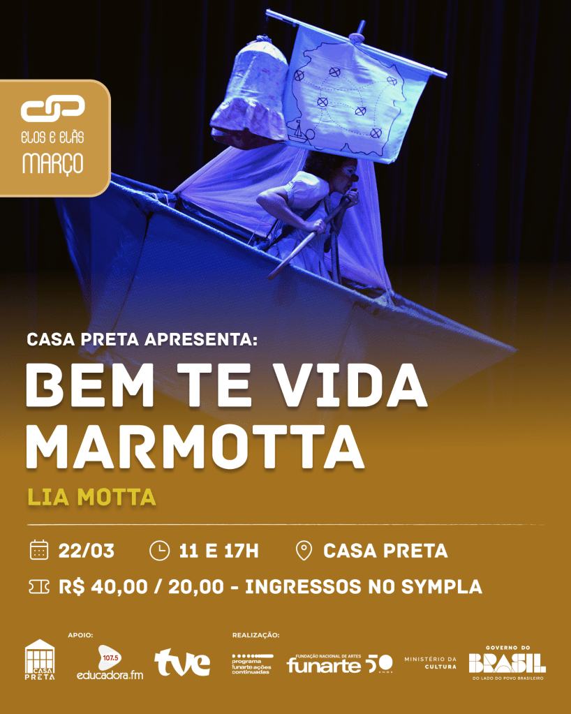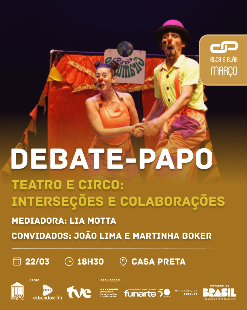 Domingo dia 22/03, às 18h, também é dia de Debate-papo na Casa Preta Espaço de Cultura com o tema “Teatro e Circo, Interseções e Colaborações”. O bate-papo será logo após a apresentação do espetáculo “Bem-Te-Vida Marmotta” e será mediado pela protagonista da peça, a atriz e palhaça gaúcha Lia Motta, tendo como convidados o ator, diretor e palhaço João Lima e a artista, pesquisadora e educadora em artes circenses Martinha Boker. A entrada é gratuita.