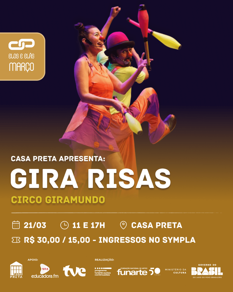 “Gira Risas é uma verdadeira explosão de humor. Somos dois palhaços latino-americanos que transformam trapalhadas, malabares, monociclo e bambolê numa festa em que o público se torna cúmplice e parte do show. Aqui, nossos erros viram risadas e a brincadeira é o motor que faz a roda do circo e do mundo girar. Um espetáculo em que arrancamos sorrisos de todas as idades, cheio de energia e diversão, criando uma ponte entre palco e plateia, que chega para encantar e fazer todo mundo acreditar no impossível”, definem os integrantes do Circo Giramundo. Os ingressos podem ser adquiridos através do sympla: https://bit.ly/4s0m9iD ou na bilheteria da Casa Preta. R$ 15,00 (meia) e R$ 30,00 (inteira). Local: Casa Preta Espaço de Cultura (R. Areal de Cima, 07 – Dois de Julho). Mais informações pelo instagram @casapretaespacodecultura ou no site https://casapreta.art.br/